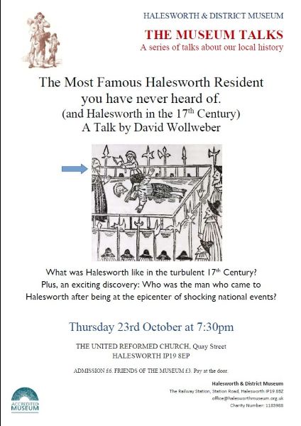 The Most Famous Halesworth Resident you have never heard of (and Halesworth in the 17th Century) A Talk by David Wollwebber. Admission £6, Friends of the Museum £3