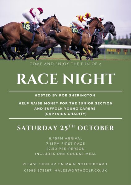 Raising money for the Junior section & Suffolk Young Carers. 6.45pm arrival, 7.15pm first race. £7.50 per person includes one course meal. Contact the Club to book.