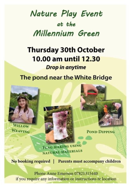 At the pond near White Bridge, Millennium Green. 10am-12.30pm. Willow weaving, natural flag making, pond dipping.